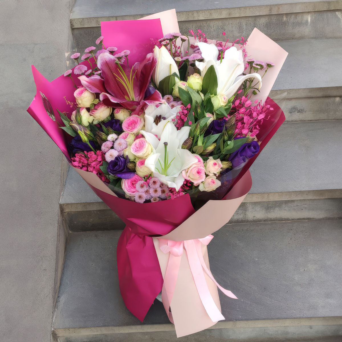 Лилия белая и розовая, роза кустовая пионовидная розовая, маргаритка розовая мини, эустома фиолетовая, лунария розовая. Упаковка (лента, пленка, крафт, сетка, пленка матовая)