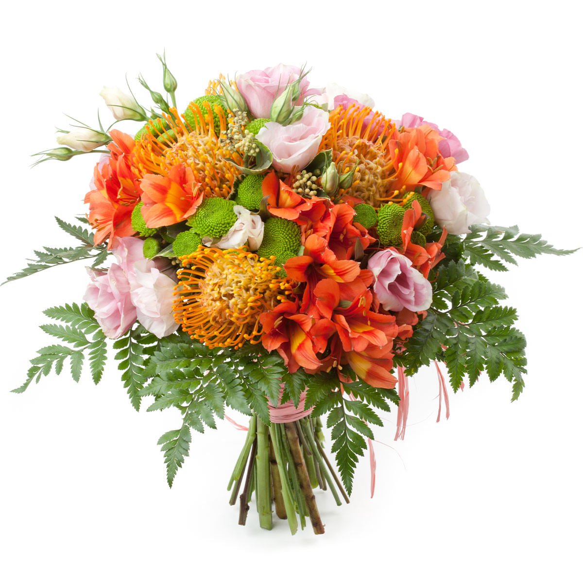 Альстромерия оранжевая, леукосперум, эустома розовая, хризантема кустовая зеленая, зелень. Упаковка (лента, пленка, крафт, сетка, пленка матовая)