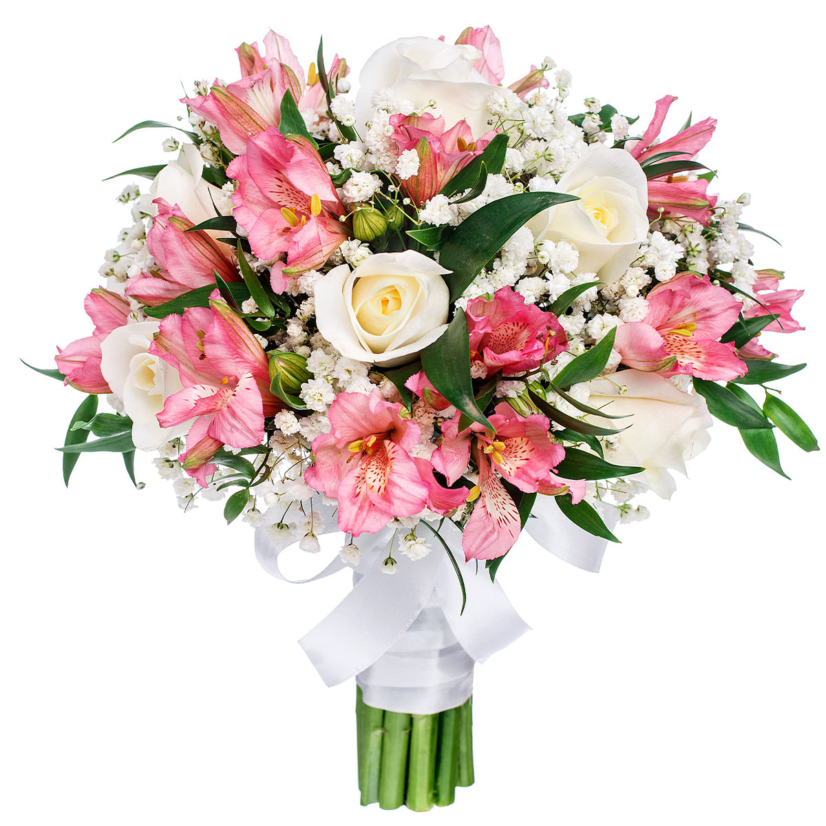 Роза одноголовая белая, эустома розовая, гипсофила. Упаковка (лента, пленка, крафт, сетка, пленка матовая)