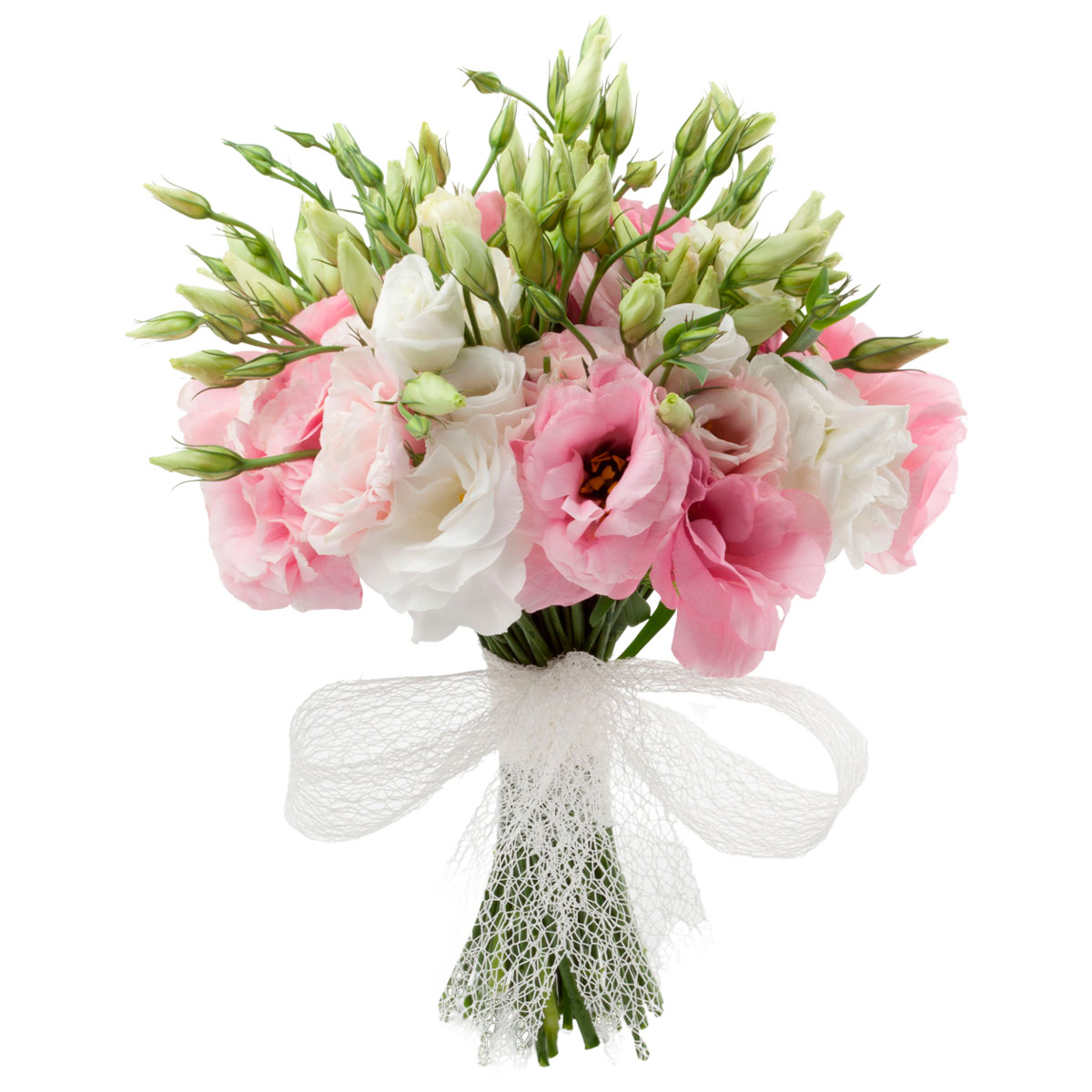 Эустома белая и розовая. Упаковка (лента, пленка, крафт, сетка, пленка матовая)