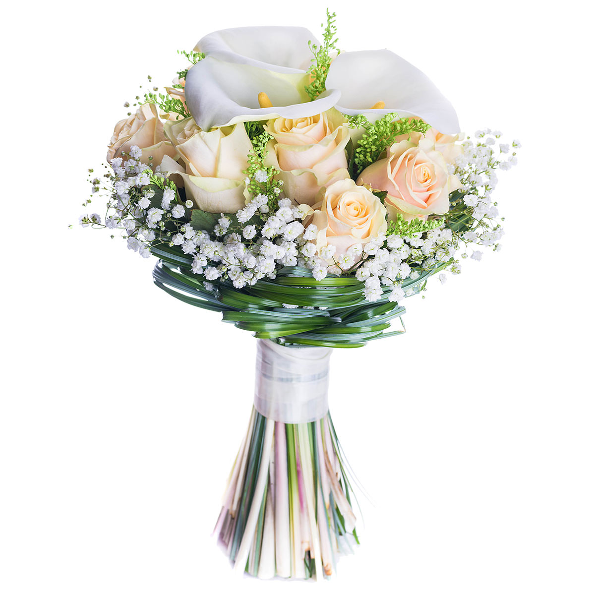Калла белая, роза одноголовая кремовая, зелень, гипсофила. Упаковка (лента, пленка, крафт, сетка, пленка матовая)