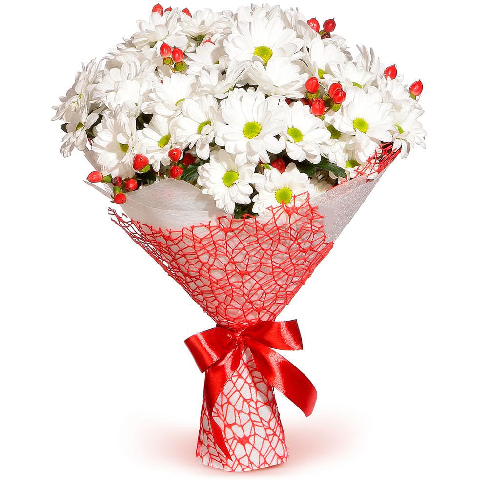 Хризантема кустовая белая, гиперикум. Упаковка (лента, пленка, крафт, сетка, пленка матовая)