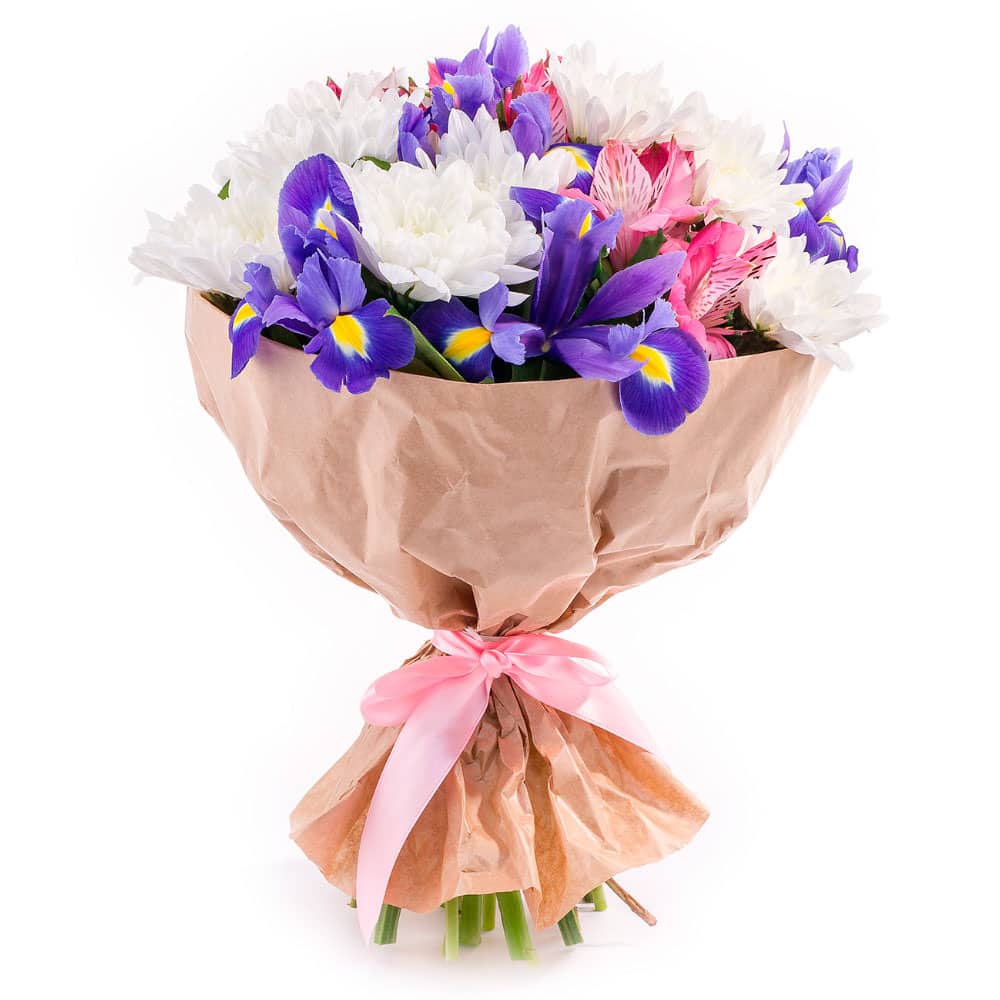 Хризантема одноголовая белая, ирис, альстромерия розовая. Упаковка (лента, пленка, крафт, сетка, пленка матовая)