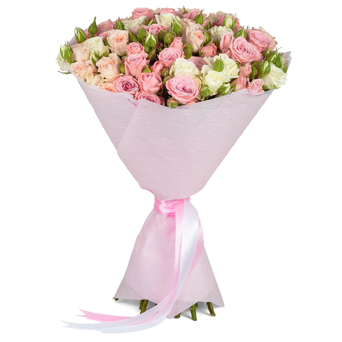 Кустовая роза белая и розовая. Упаковка (лента, пленка, крафт, сетка, пленка матовая)