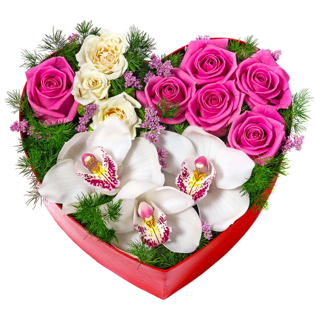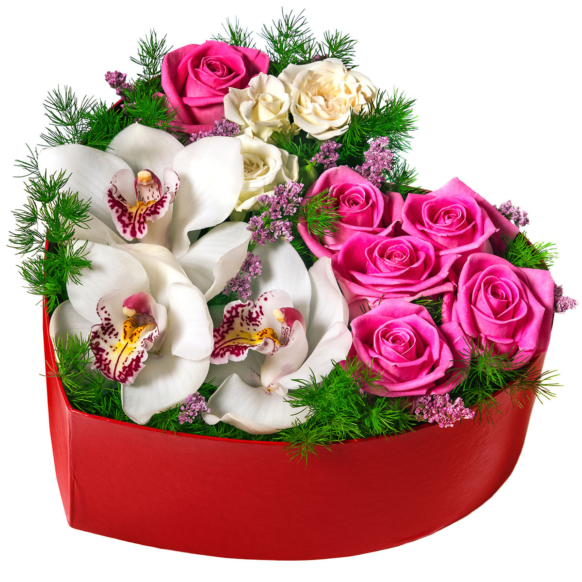 Орхидея белая, роза одноголовая розовая, роза кустовая белая, аспарагус, солидаго. Упаковка (шляпная коробка, квадратный бокс, коробка сердце, оазис)