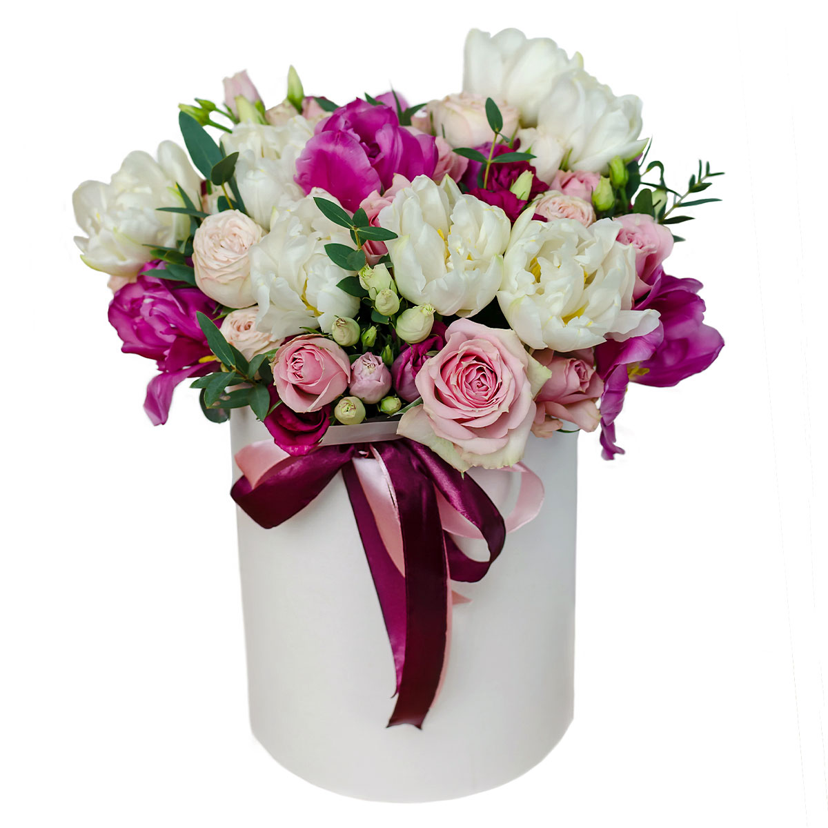 Тюльпан белый и сиреневый, роза кустовая сиреневая и белая, эвкалипт. Упаковка (шляпная коробка, квадратный бокс, коробка сердце, оазис)