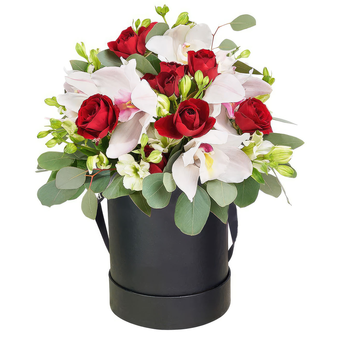 Роза одноголовая красная, орхидея белая, альстромерия белая, эвкалипт. Упаковка (шляпная коробка, квадратный бокс, коробка сердце, оазис)